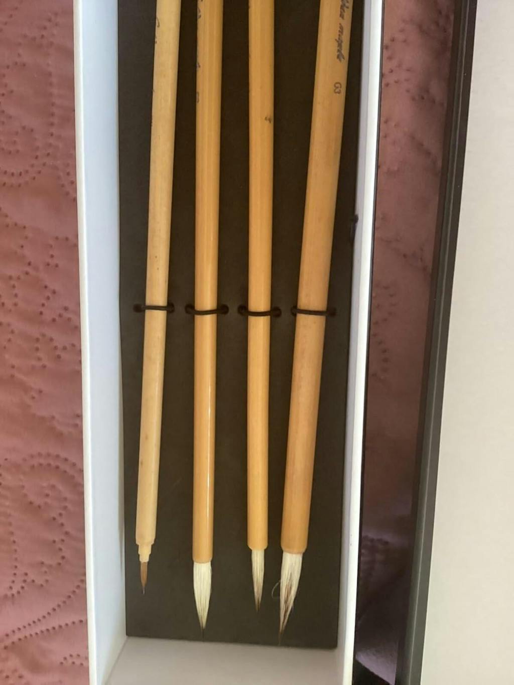 I’ve used Golden Maple products before. In each instance, including this one, their products are beautifully presented, and quite lovely to use. To give you an idea of my own frame of reference here: my first “professional” grade watercolor brushes were Chinese calligraphy/sumi brushes, which I basically wore down to a nub, lol. These Lee Qiuming brushes by Golden Maple are so much more exquisite and fine than those initially bought by me. And here’s the kicker: both sets were roughly in the same price range. But my initial set did not offer the precision of line, or the tightly secured hairs, that these GM brushes do. “Exquisite” really is the best descriptor. These brushes are so sensitive and fine, that I actually had to change them up for other Golden Maple brushes while painting florals. What I mean is that these calligraphy brushes are the pinch hitters for tasks such as precision painting tiny dew drops on the flowers, or lines of fine color, such as the veins in leaves, or the fine lines in portrait painting. But larger brushes are necessary to fill in the bulk of color. They are exactly as advertised, in other words. To go back to the biography of artist Lee Qiuming on the back of the box, there are these words written: “ …calligraphy and painting are the traces of an intellectual’s minds, the brush follows the heart and ink dances to the rhymes of the soul.” This sentiment, in turn, is quite similar to a quote that I heard from an old grand master wood block print carver in Japan, who explained that each calligraphic character, and illustrative form in fact, was comprised of a line that was firm and sure handed, but also a complementary line on the same character that trembled with emotion, ever so slightly. I do believe that these brushes are precision instruments to do just that. I have tried my own hand at Sumi, Kanji, calligraphy, and illumination, and let me tell you: none of these beautiful, disciplined arts are easy. In fact, in my opinion, they can be extremely difficult. Especially when painting on a surface like silk. I do hope to come back and update this review with more images of my attempts to paint with these on silk and rice paper. Until then, I wanted to get my review out expeditiously so that customers would know my opinion while these brushes are priced within the $20-$30 range for all four, which I think is quite reasonable.