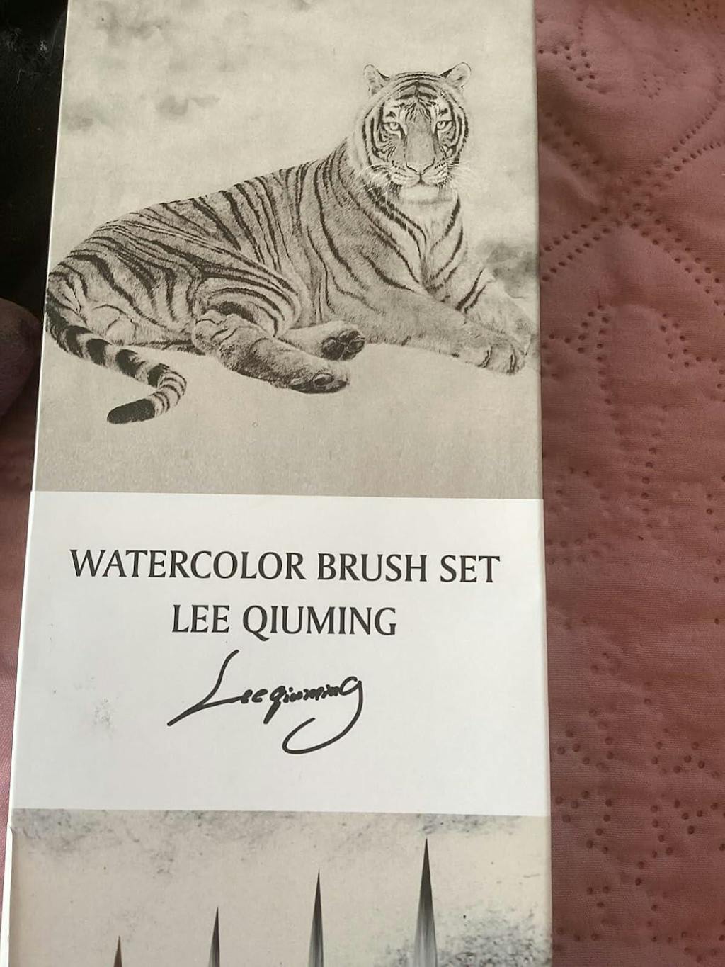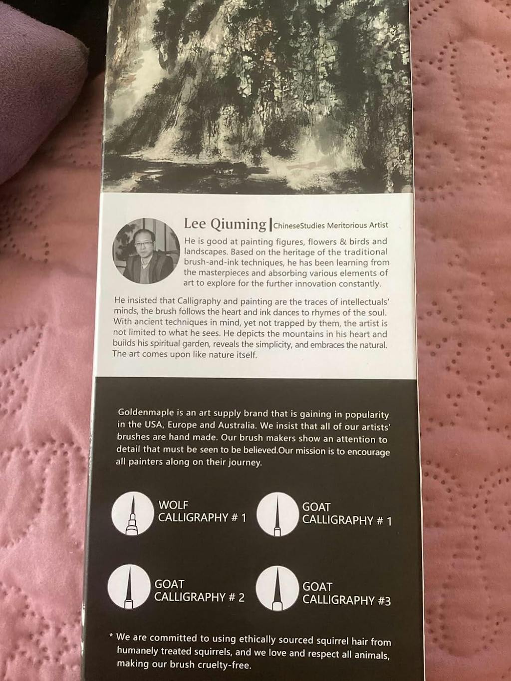 In the images that I’ve included thus far ( more will come), I’ve tried to show you the box that contains the four calligraphy/sumi/watercolor brushes, the information on the back, which gives a brief biography of Lee Qiuming, a “Chinese Studies Mertorious Artist” which implies, but not explicitly stated, that these brushes were curated or endorsed by him. Then, there is information about each of the four brushes themselves. Curiously, the brushes are listed as containing goat and wolf hair, but then on the bottom, there is a blanket disclaimer about their commitment to “ethically source squirrel hair, that they love all animals, and that their products are cruelty free”. The company that put this set together is called, “Golden Maple”.