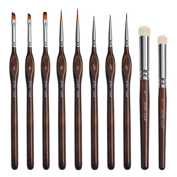 🍁【Expressive Potential】8 model paint brushes of different shapes and sizes(Angle 0, 2, Flat 1, Round 0, 1, Liner 2/0, 3/0, 5/0 ) and 2 large size dry brush, it will satisfy all your needs of detail painting,ensure you're getting the best fine detail brushes for your painting. Achieve depth and emphasis in your artwork by utilizing the dry brush's textured backgrounds to highlight focal points that are then further accentuated by the sharp lines from the detail paint brushes.