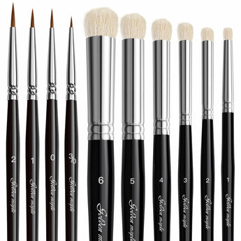 🍁【Expressive Potential】4 model paint brushes of different shapes and sizes(Liner 3/0, 0, 1, 2) and 6 dry brush, it will satisfy all your needs of detail painting,ensure You're getting the best fine detail brushes for Your Painting. Achieve depth and emphasis in your artwork by utilizing the dry brush's textured backgrounds to highlight focal points that are then further accentuated by the sharp lines from the detail paint brushes.