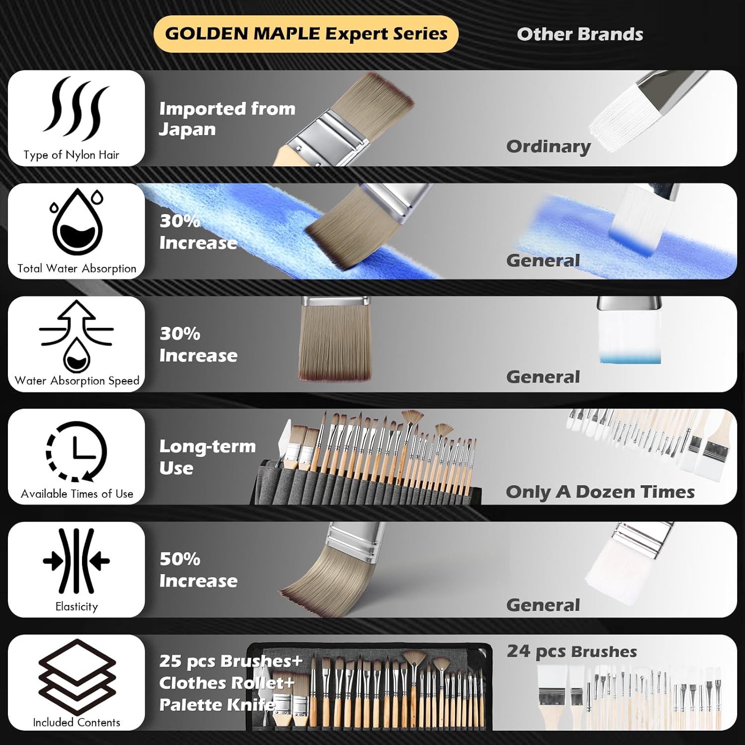Maple emas 25 buah kuas cat untuk lukisan akrilik cat air Minyak & kanvas, Set sikat sintetis yang ditingkatkan dengan gulungan kain dan pisau palet