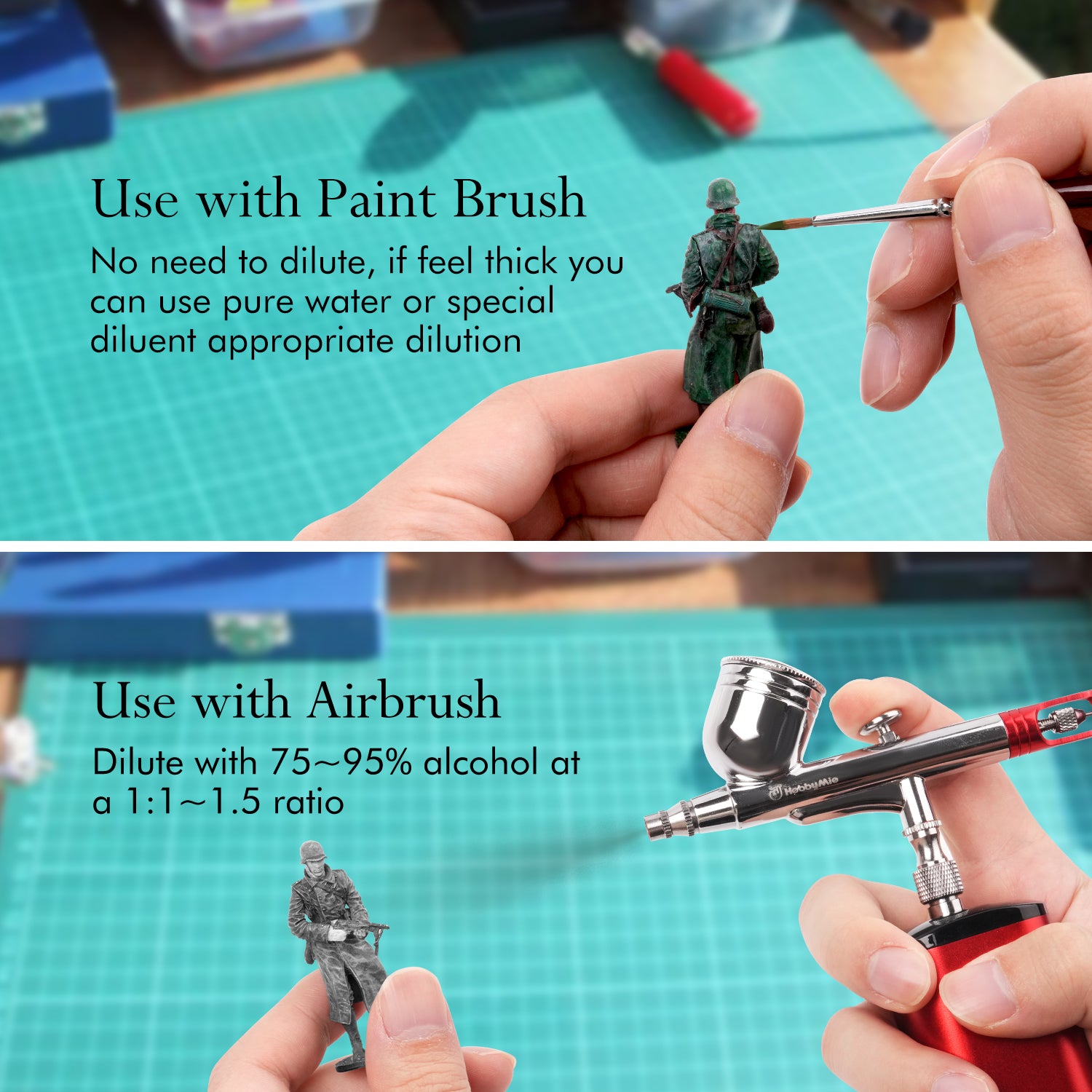 - How to Dilute While Using These Miniature Paints: ①Use as airbrush paint: Dilute with 75%~95% alcohol or IPA at a 1:1~1.5 ratio. ②Use with Paint Brush: You can not need to dilute, if you feel thick you can use pure water or special diluent appropriate dilution.